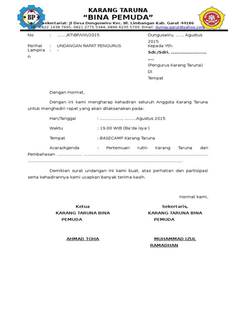 Contoh Surat Undangan Rapat Karang Taruna Word / Contoh Surat Undangan Rapat Karang Taruna Doc File Nyantaidulu - Dalam kesempatan ini, akan dijelaskan tentang surat undangan untuk rapat.